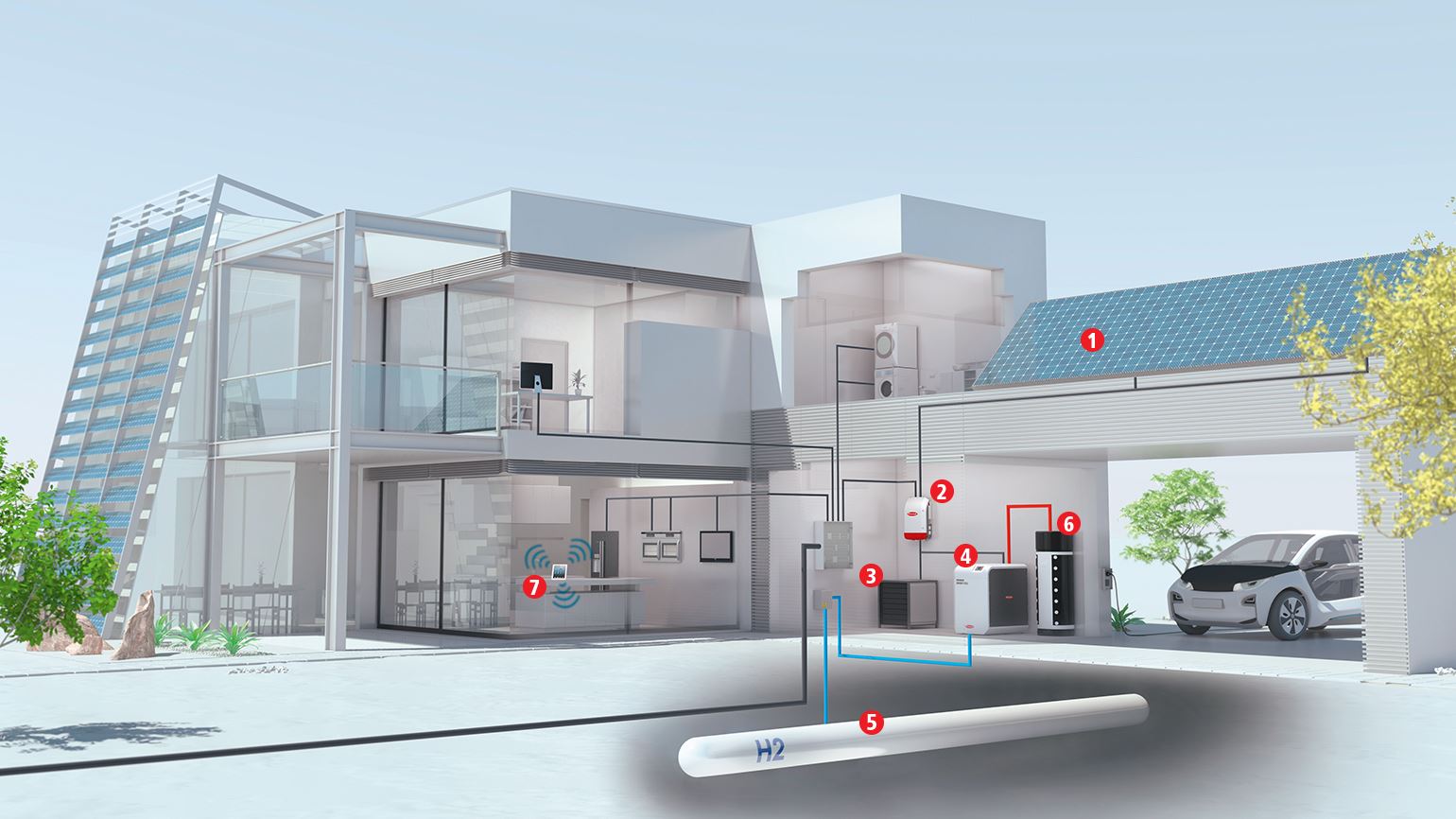 Der H2 Speicher kommt dann ins Spiel, wenn sowohl der Batterie-Speicher im Haus als auch der Akku des E-Autos schon geladen ist und der Wärmespeicher (Brauchwasser) schon aufgeheizt ist